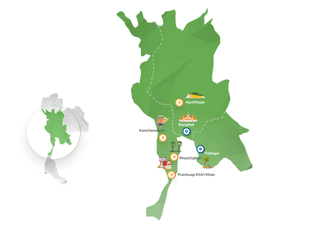 此外,在中部地区,从豪华酒店到民宿有多种住宿可供选择。还有可以了解当地生活方式并可接待团队参观的地方。例如骄傲花园(Poomjai Garden),一家餐厅和Bang Khun Thian孩子们引以为傲的开放式教育花园,其中还有一家使用当地食材烹制泰餐的工作坊。