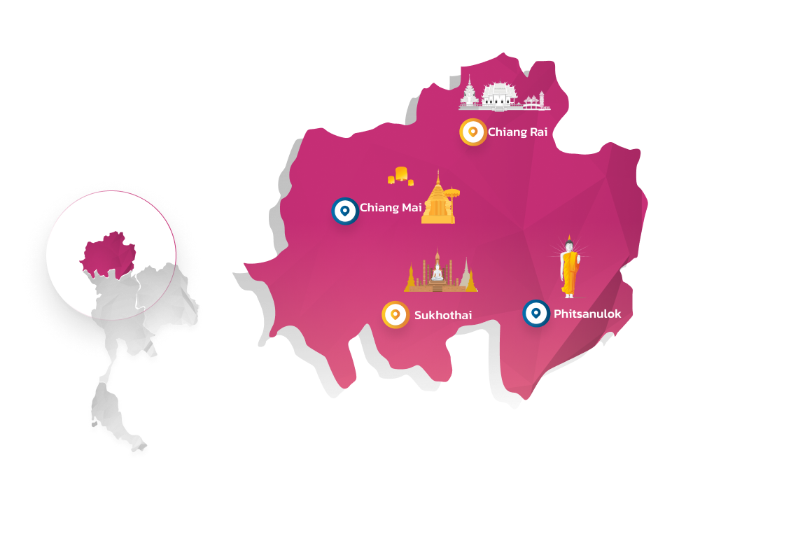 清迈是北部地区的主要城市,也是泰北经济中心,有教育机构作为国际级知识和研究基地,设施配备齐全。这里地形以结构复杂的大小山脉为主,适合种植寒性的经济作物,尤其是高品质的茶和咖啡,并以五颜六色各种美丽的花朵闻名。这里是兰纳文化的故乡,传统仍在这里代代相传,例如,传统梭织布的穿法,在不同的地方是有区别的。